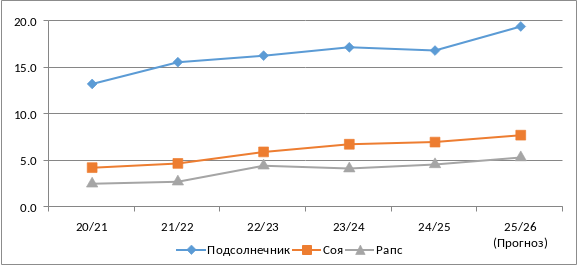 Валовый сбор подсолнечника, сои и рапса по аграрным сезонам, млн тонн
