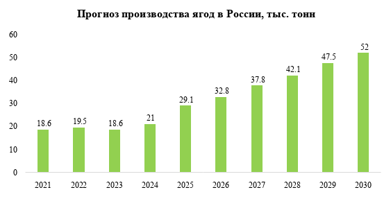В 2030 году результат может вырасти в 1,8 раза относительно 2025 года - до 52 тыс. тонн. Факторами развития отрасли выступают интенсификация производства и рост производительности труда за счёт механизации сбора ягод и использования защищенного грунта, что снижает риски производства.