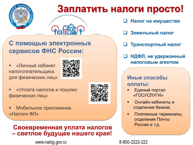 Налоговая служба рекомендует не откладывать оплату на последние дни и своевременно исполнять свои обязанности, ведь налоговые поступления вносят важный вклад в развитие социальных программ, обороны, здравоохранения, инфраструктуры и других сфер деятельности государства, так и для самого гражданина.