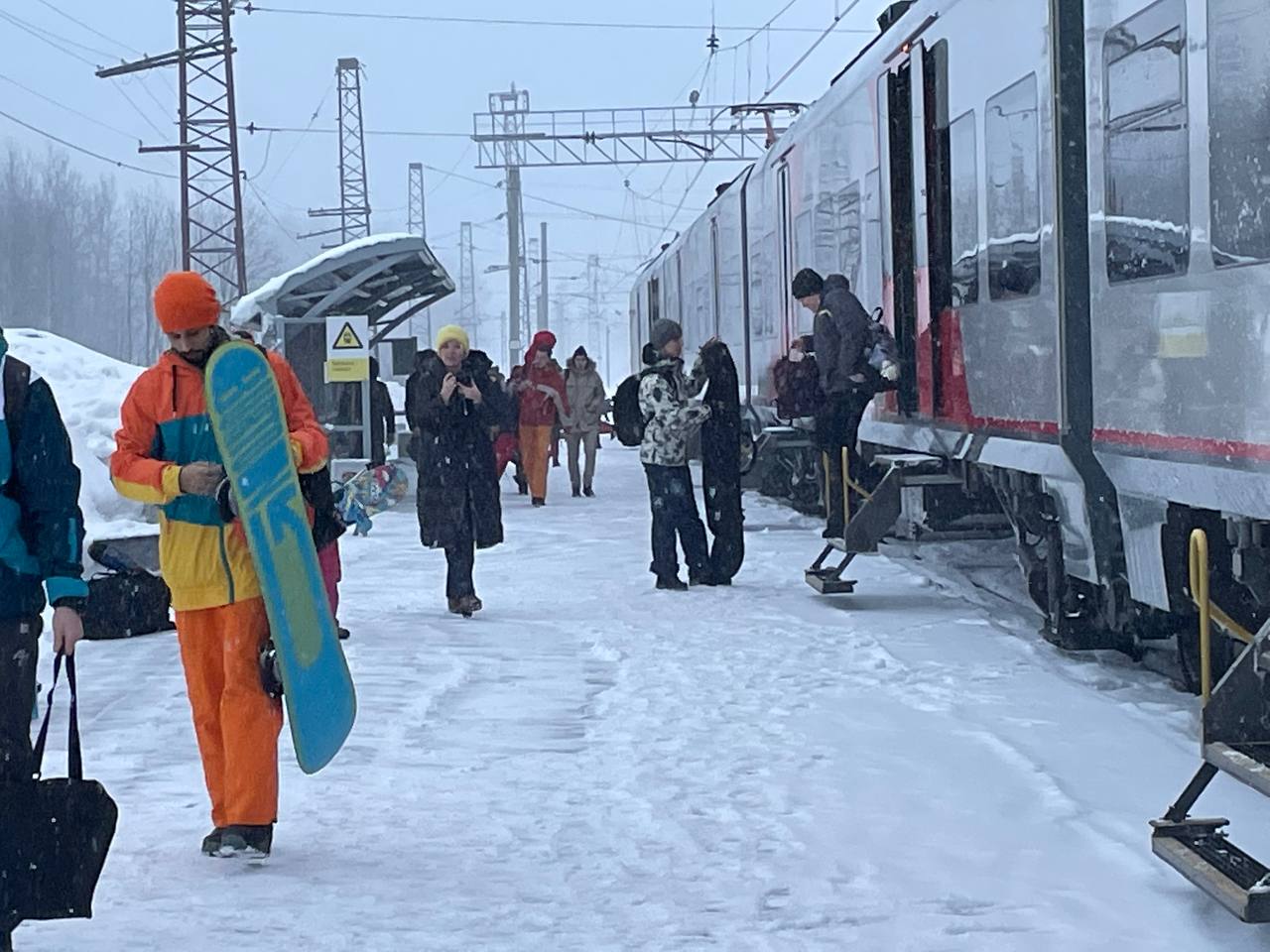 Для удобства пассажиров в вагонах электрички обустроены специальные места для размещения спортивного инвентаря. Лыжи и сноуборды в чехлах можно перевозить бесплатно.