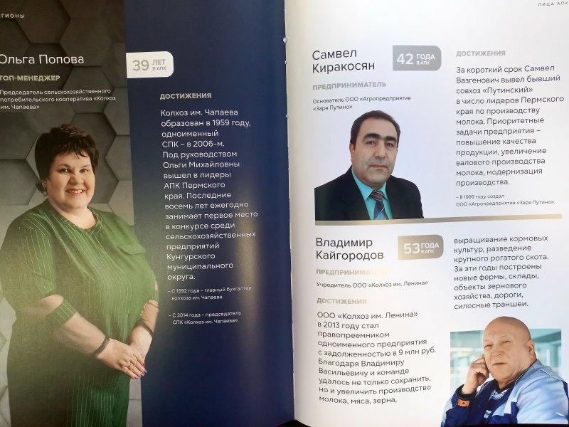 Сферу АПК Пермского края представляют председатель СПК «Колхоз им. Чапаева» в Кунгурском районе Ольга Попова, основатель ООО «Агропредприятие «Заря Путино» в Верещагинском Самвел Киракосян и учредитель ООО «Колхоз им. Ленина» в Сивинском Владимир Кайгородов с кратким описанием созданных и возглавляемых ими успешных хозяйств.