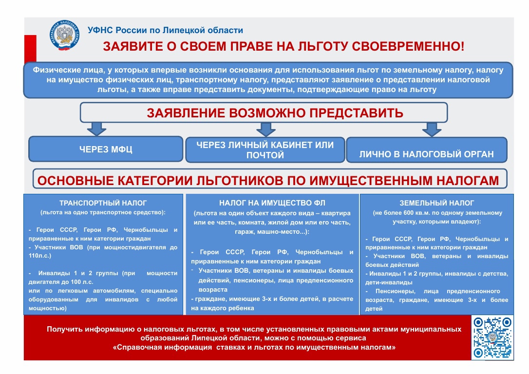 Собственникам имущества, у которых право на льготу по транспортному, земельному налогам и налогу на имущество физических лиц возникло впервые в 2025 году (за исключением категорий лиц, получающих льготы в беззаявительном порядке) или в случае, когда льгота не была учтена в полученном налоговом уведомлении, рекомендуем подать заявление о налоговой льготе, любым удобным для налогоплательщика способом: