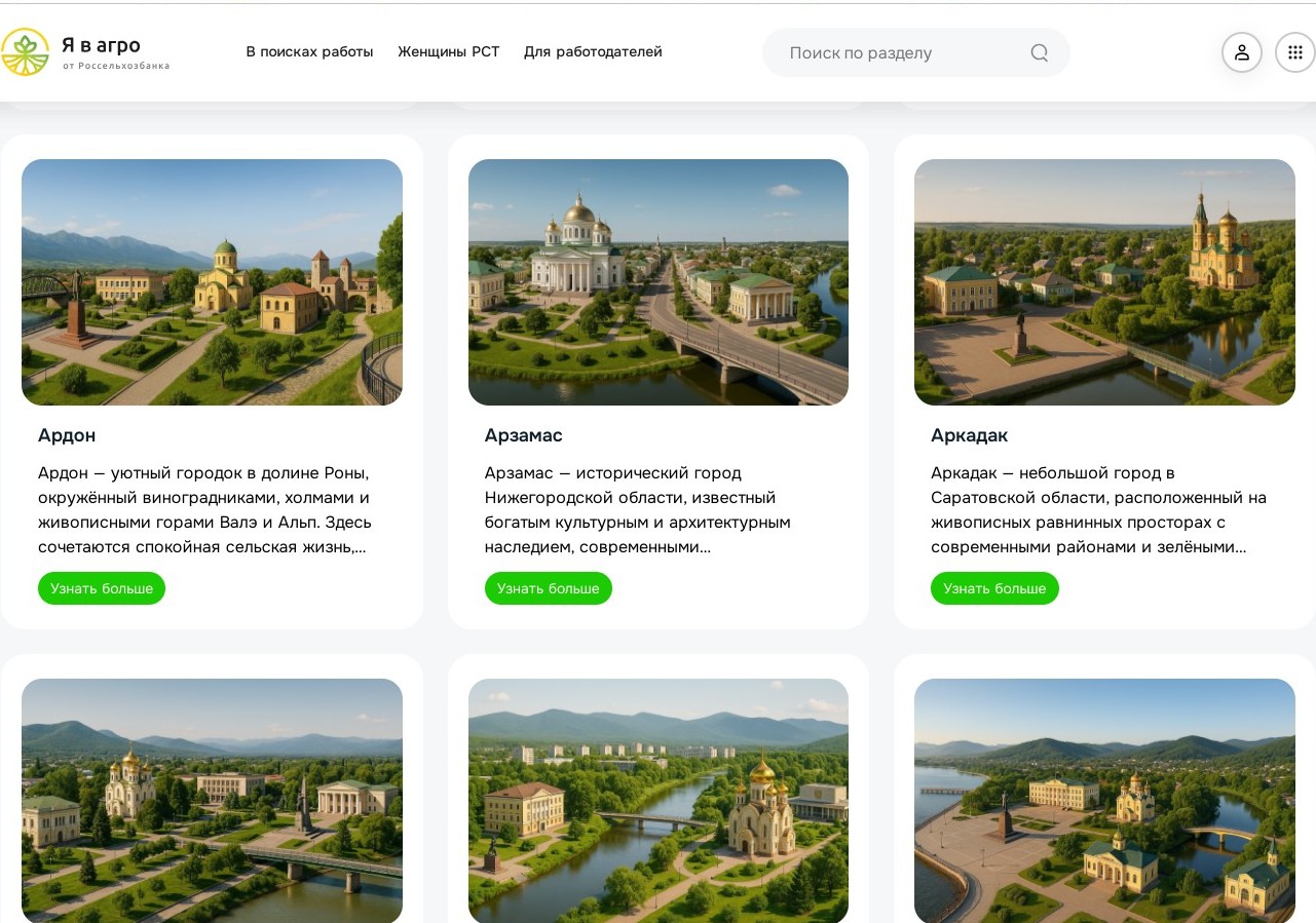 Новый сервис решает одну из основных проблем трудоустройства в другом регионе — недостаток информации о жизни в новом городе. Детальные страницы на «Я в Агро» выступают в роли цифрового гида, позволяя заранее изучить все аспекты жизни, что повышает уверенность специалистов в принятии решения о переезде.