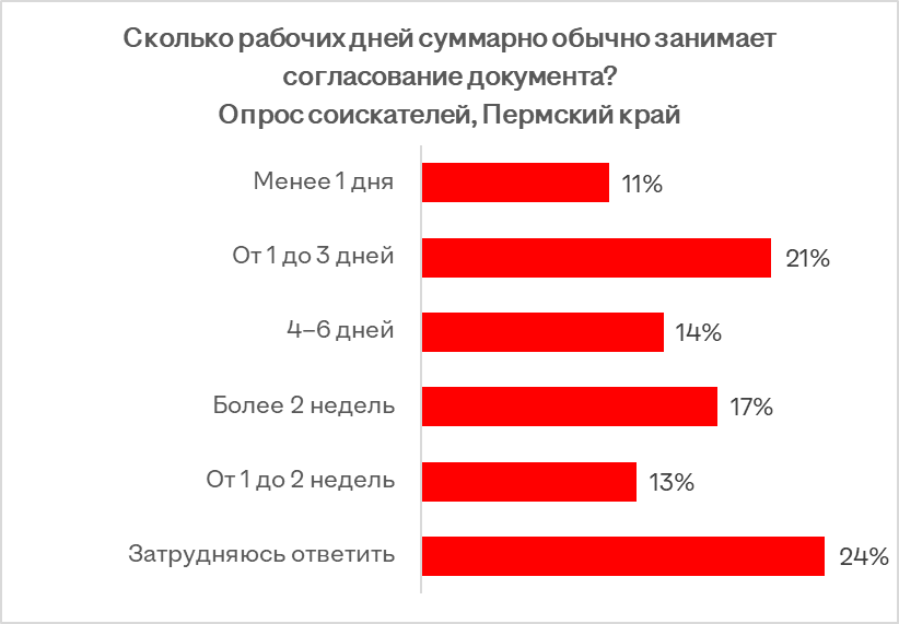 По данным опроса hh.ru, 21% соискателей из Пермского края в среднем тратят от 1 до 3 дней на согласование различных документов на работе. У 14% респондентов этот процесс занимает 4-6 дней, у 13% - от 1 до 2 недель, а у 17% - более 2 недель. Лишь 11% пермяков согласуют документы в течение своего рабочего дня.