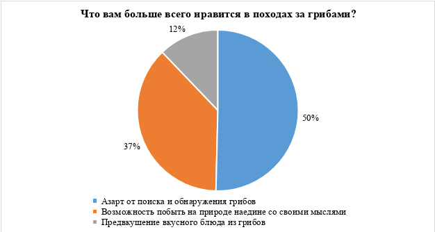 Зачем идти по грибы. На вопрос о мотивации для похода за грибами каждый второй (50%) ответил, что ценит его как возможность побыть наедине с природой и своими мыслями. Чуть более трети (37%) привлекают азарт поиска и обнаружения «добычи». Лишь 12% указали как основной мотиватор предвкушение вкусного блюда.